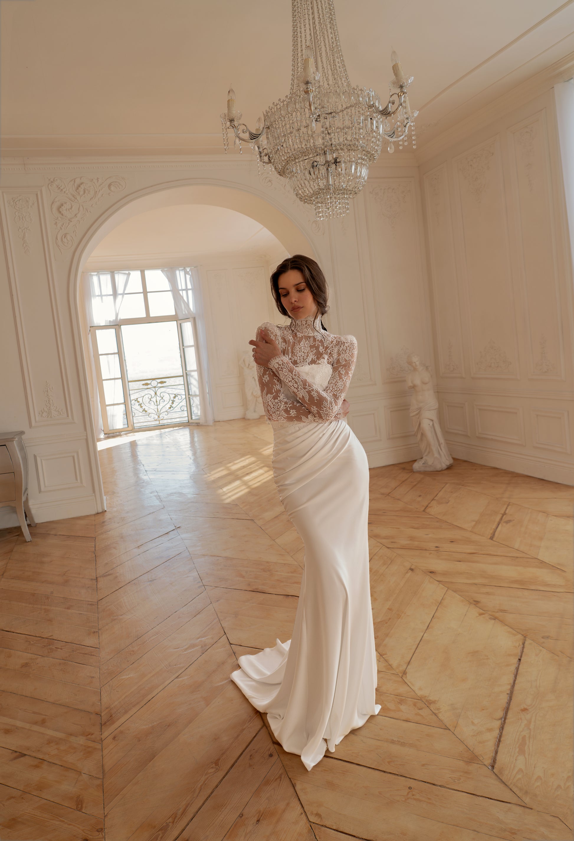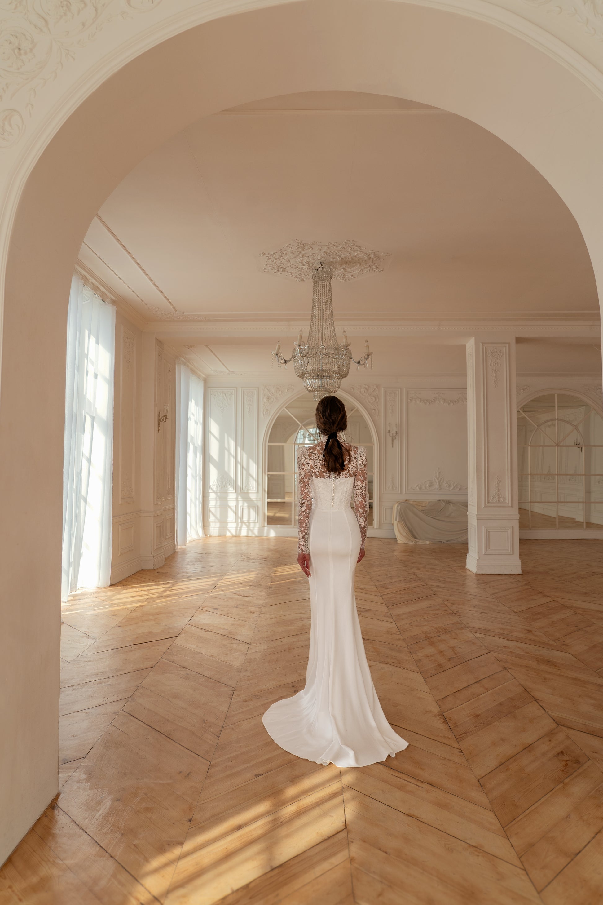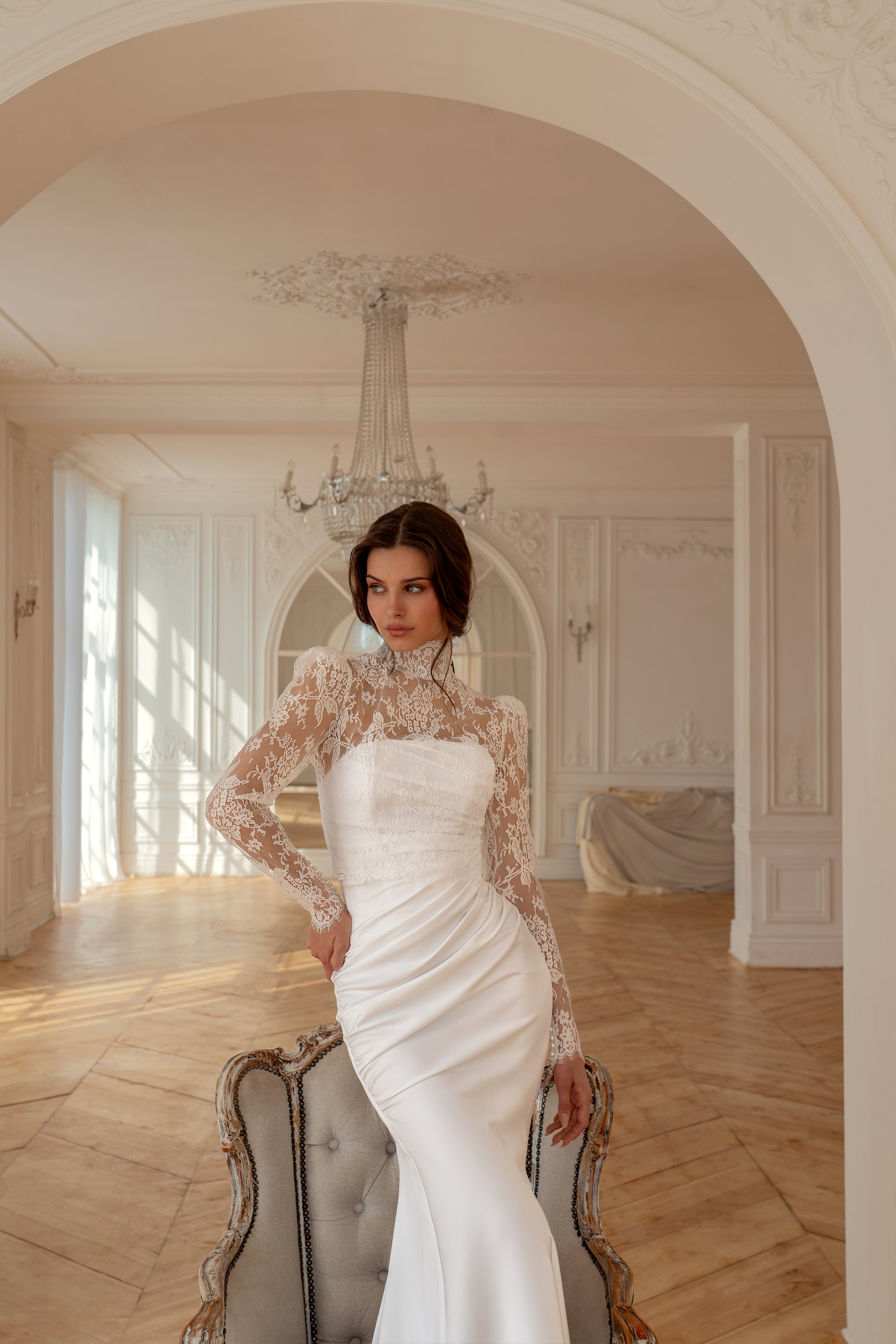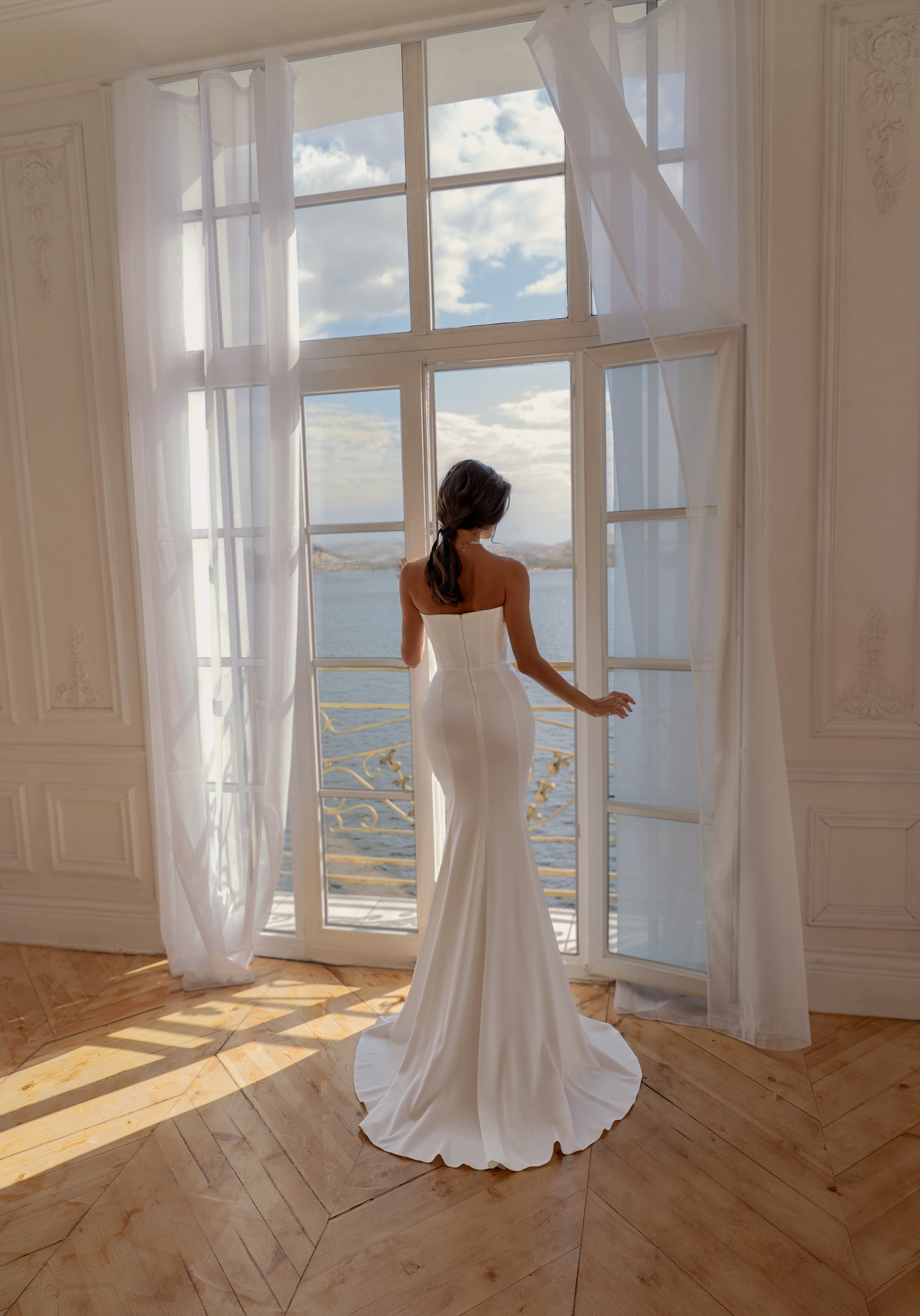 This minimalist strapless wedding dress features a clean, fitted silhouette that elegantly highlights the figure. Soft draping across the bodice adds structure and sophistication. Paired with an optional lace long-sleeve bolero, the look transforms effortlessly from modern simplicity to romantic elegance — perfect for ceremony and reception styling.