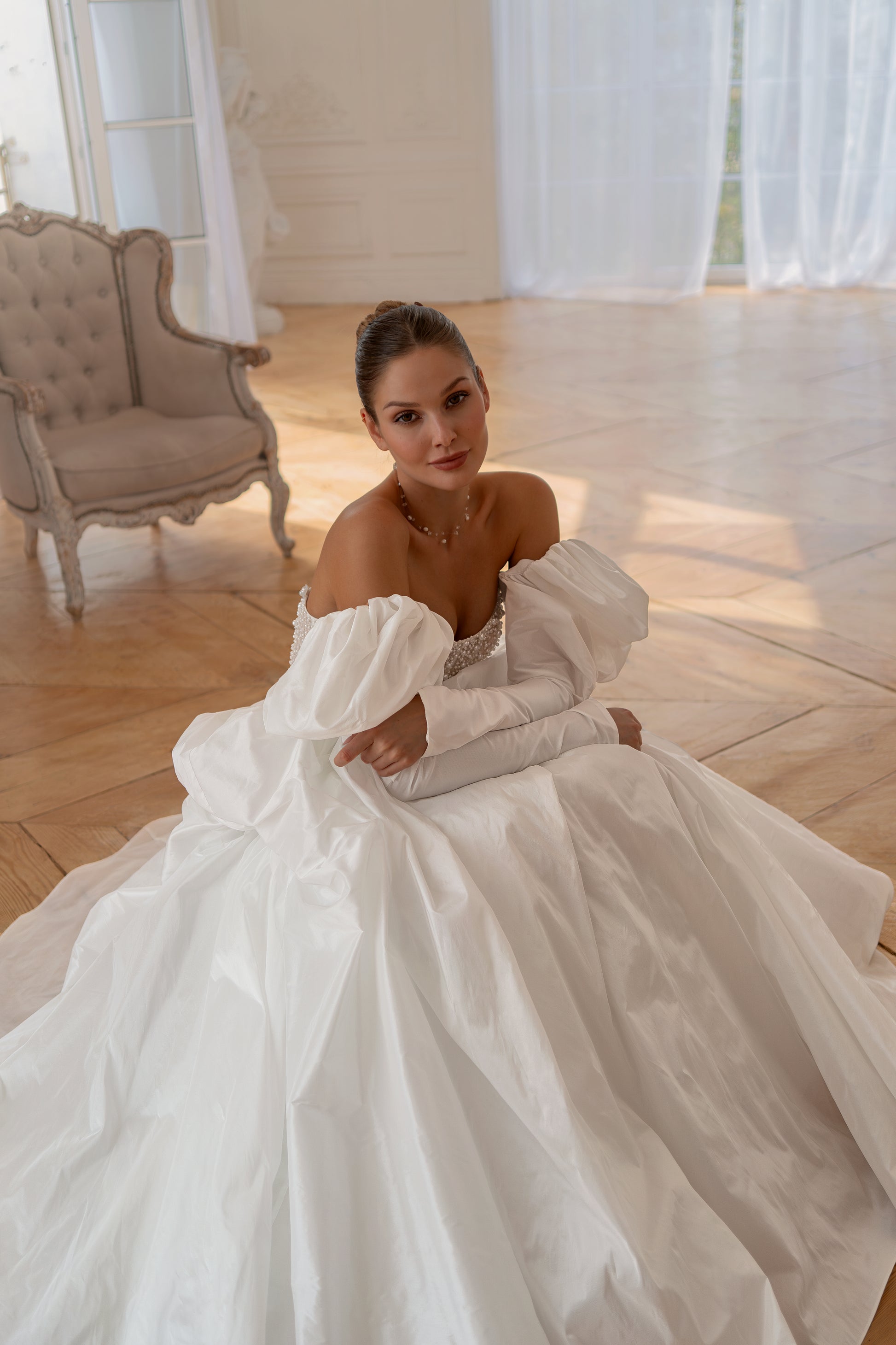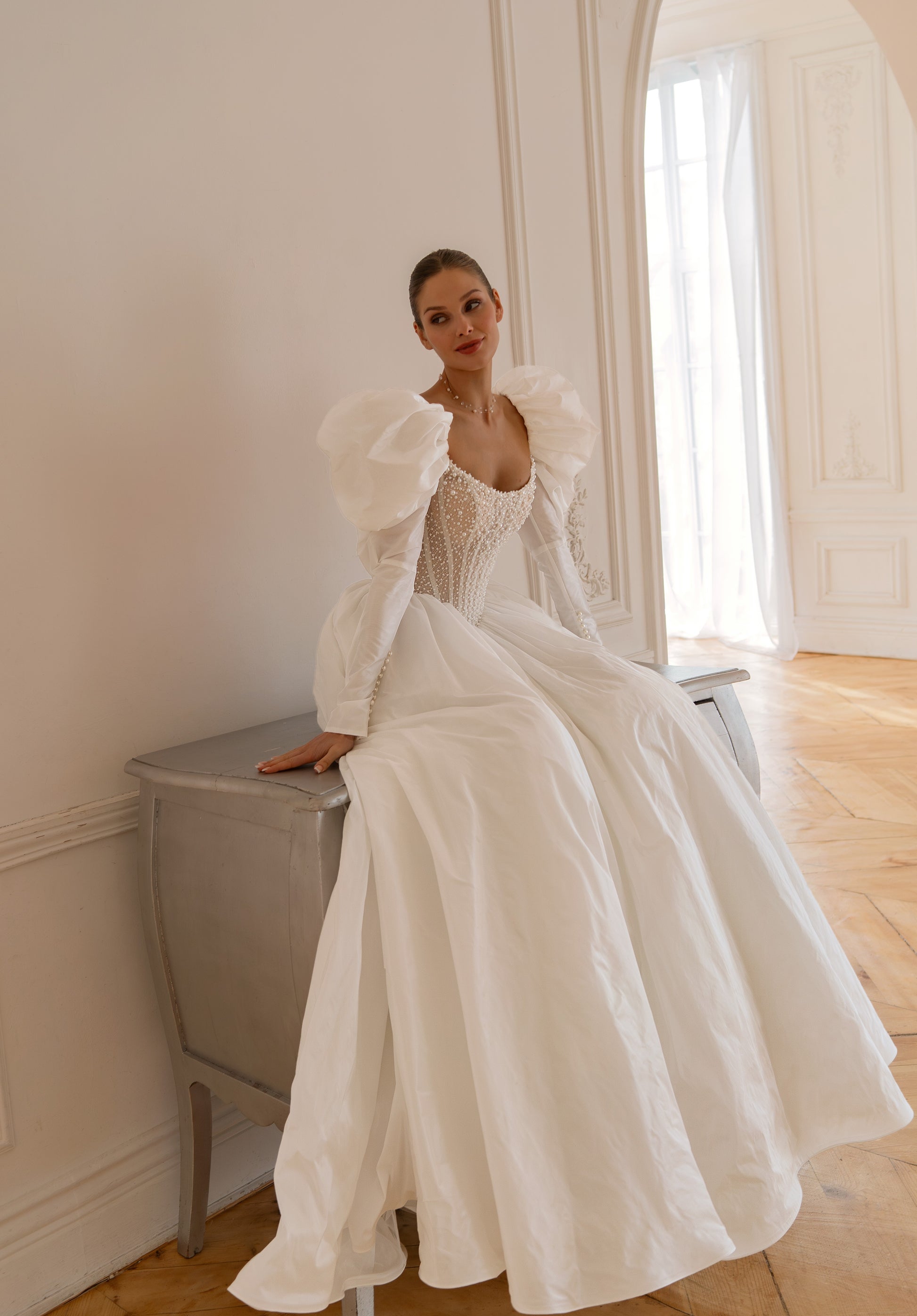 This romantic ball gown wedding dress features a beautifully structured corset bodice that defines the waist and enhances the silhouette. Statement puff long sleeves add a couture-inspired touch, while the full, flowing skirt creates an elegant and timeless bridal presence. Perfect for brides dreaming of a classic yet fashion-forward wedding look.