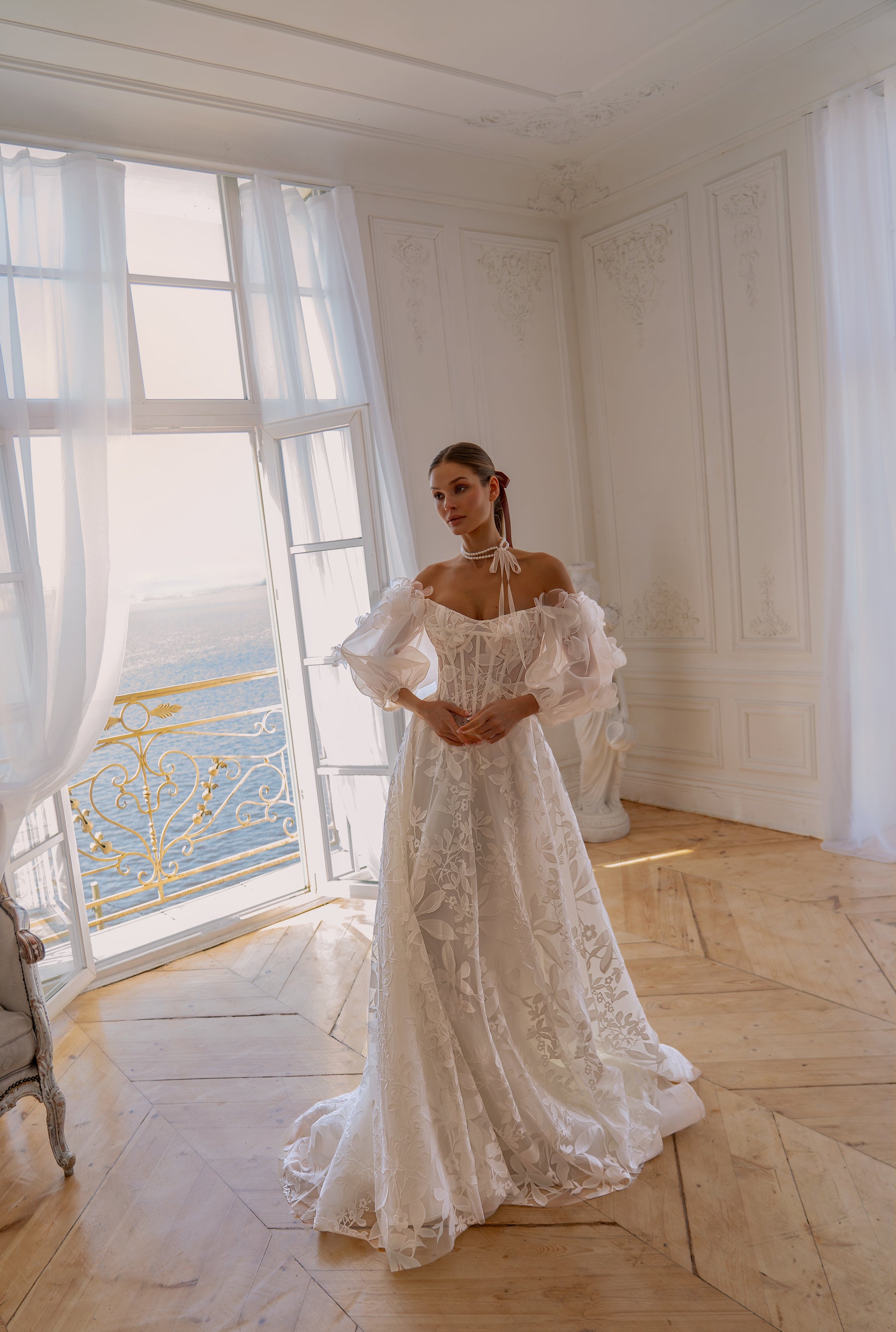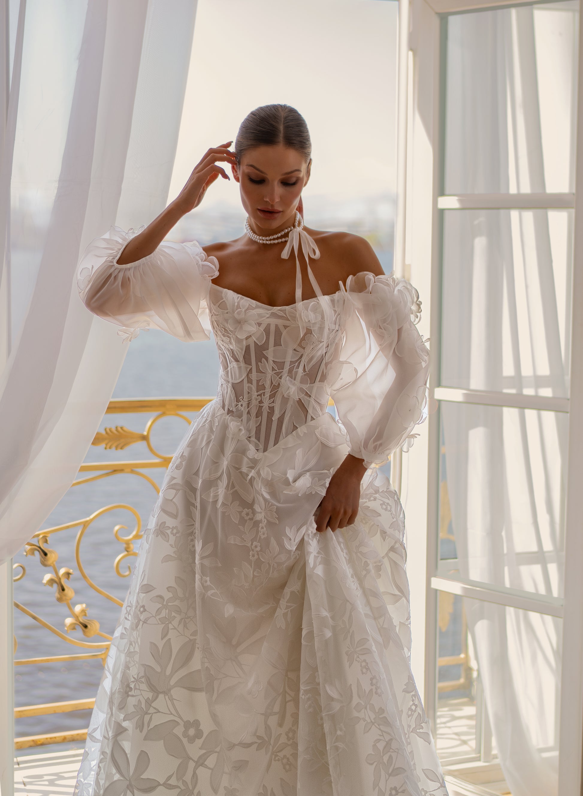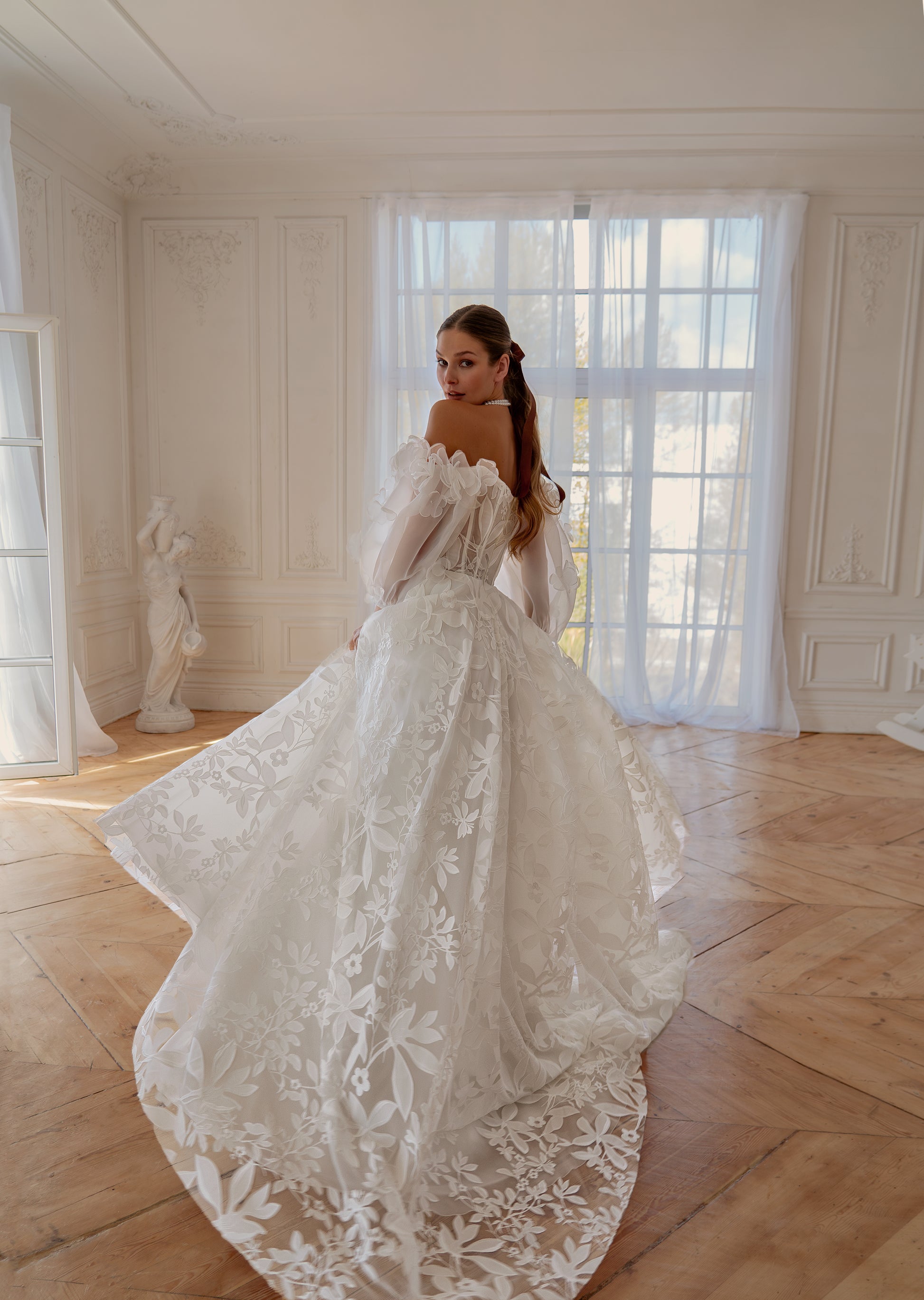 This romantic off-shoulder wedding dress features a beautifully structured corset bodice with sheer detailing that enhances the silhouette. Soft puff sleeves and delicate floral lace create an airy, feminine feel, while the flowing skirt adds effortless elegance. A perfect choice for brides seeking a refined yet modern romantic style.