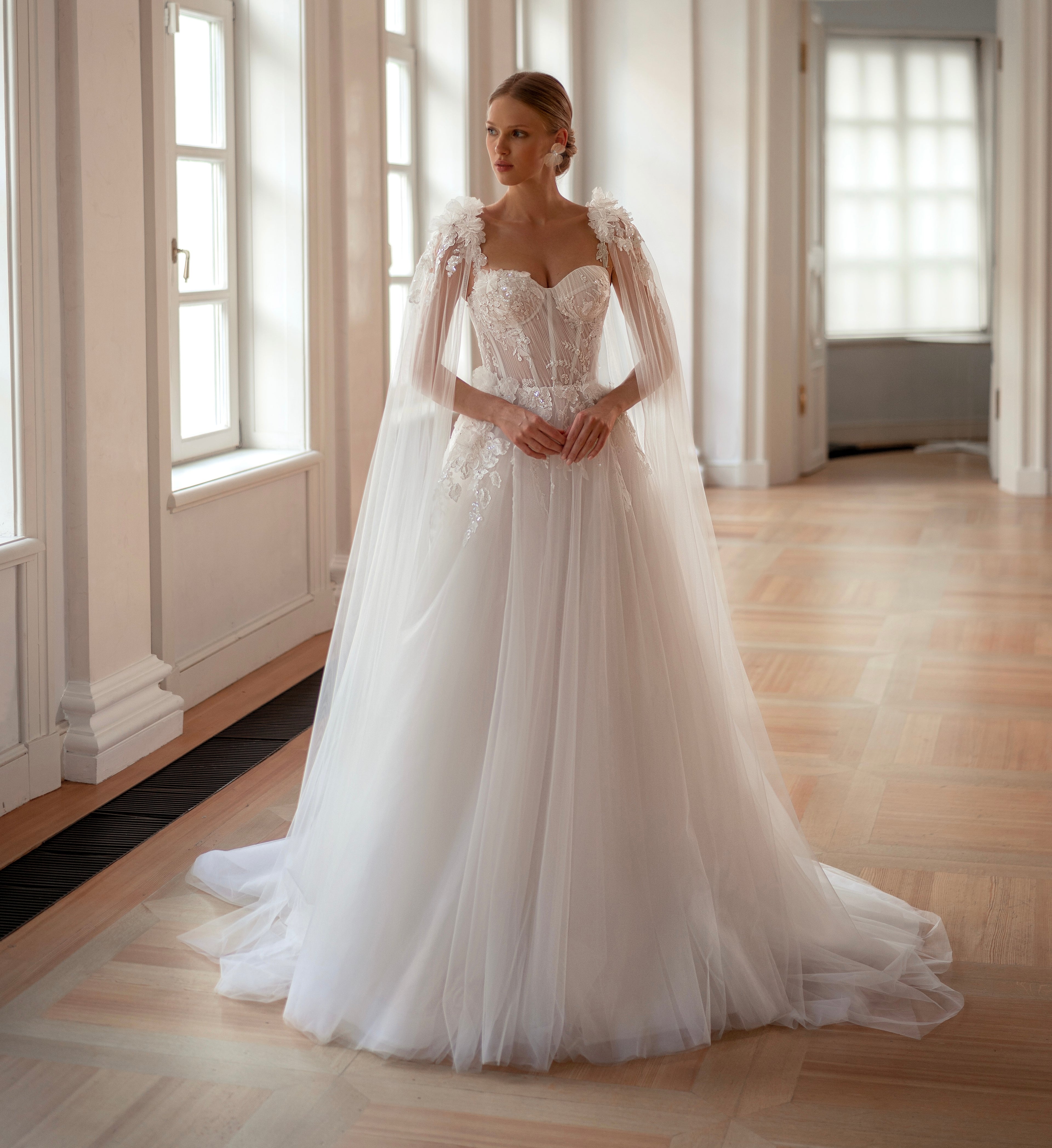 ALESSIA Īsa spīdīga kāzu kleita ar apmetni