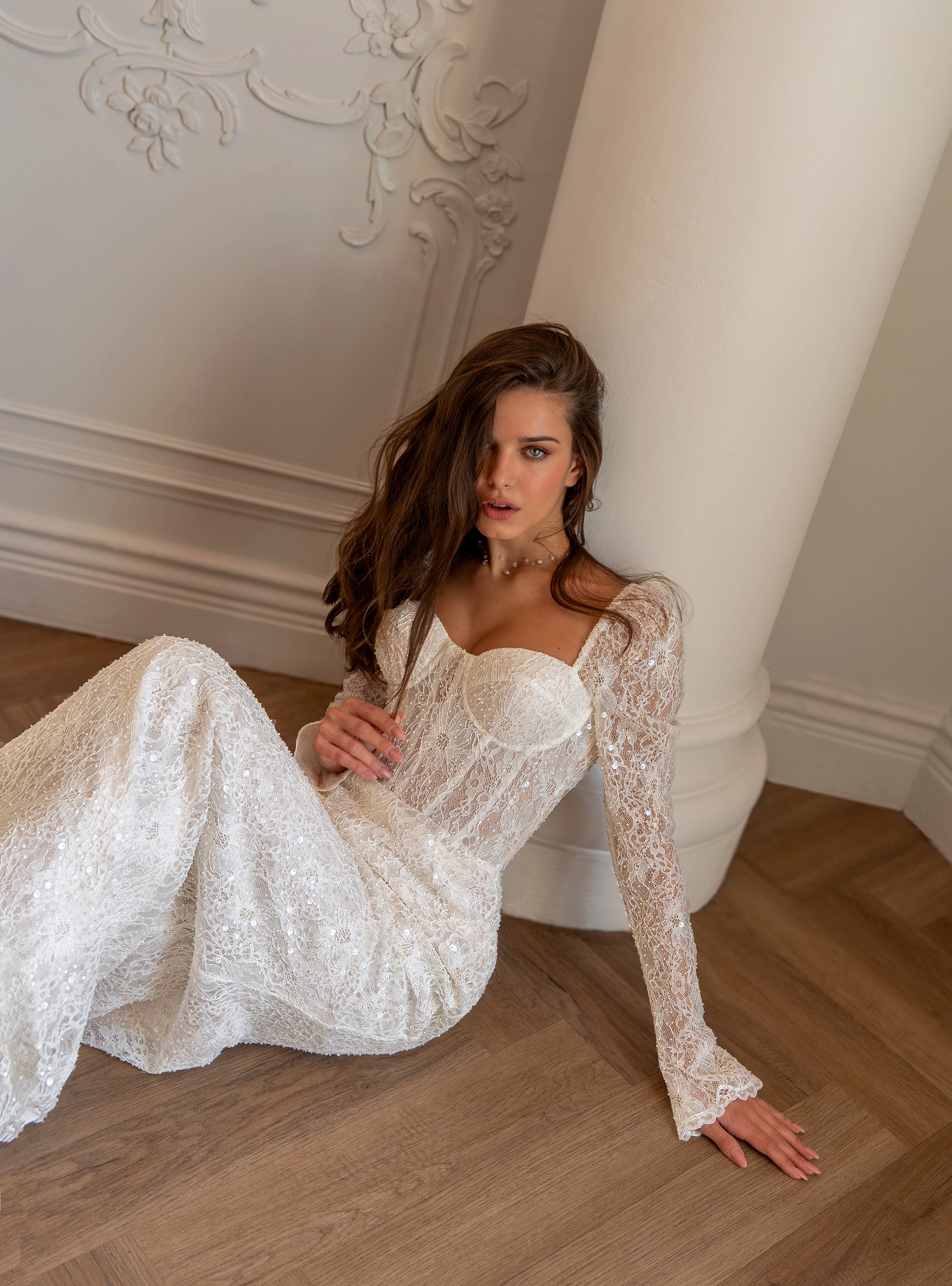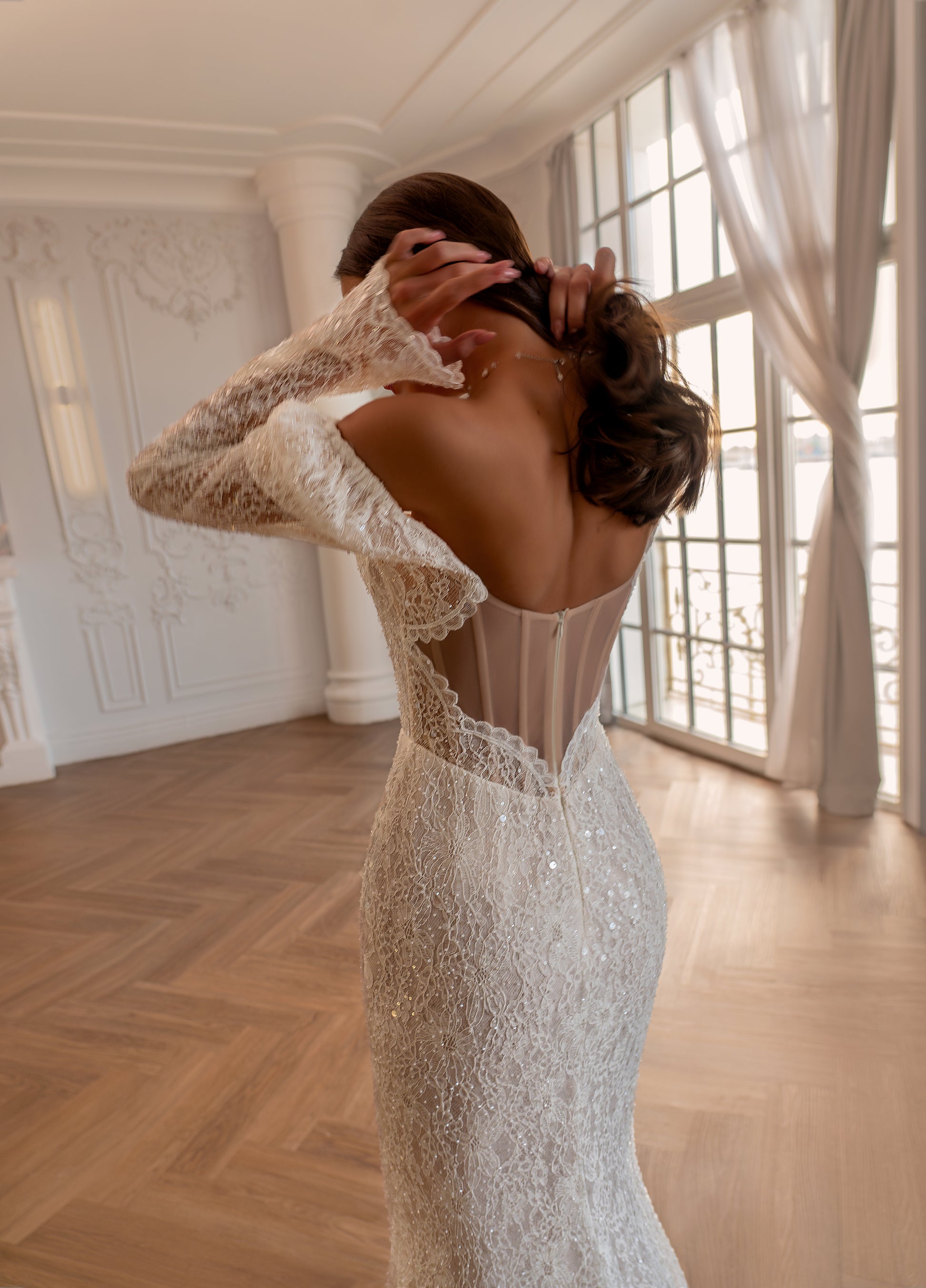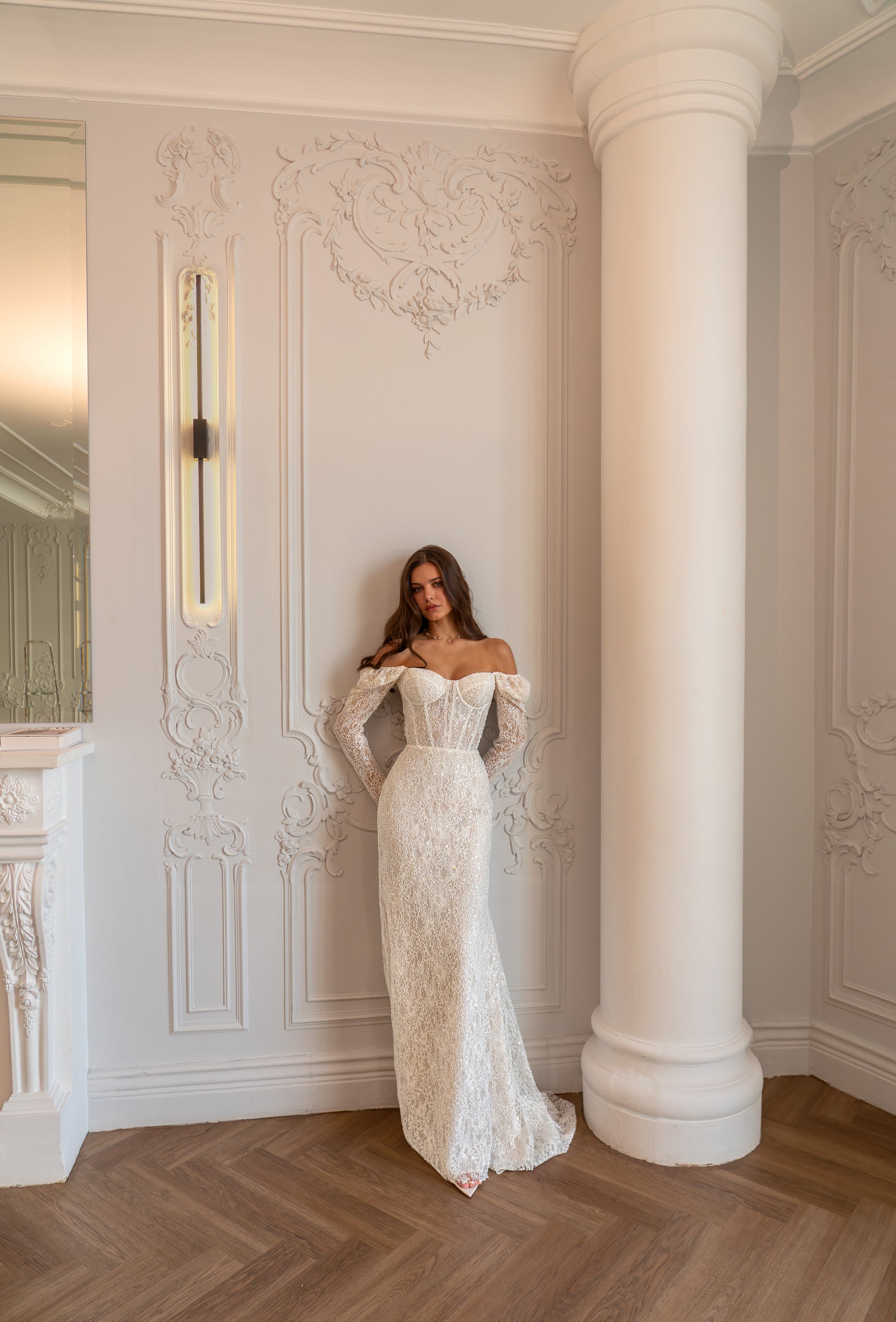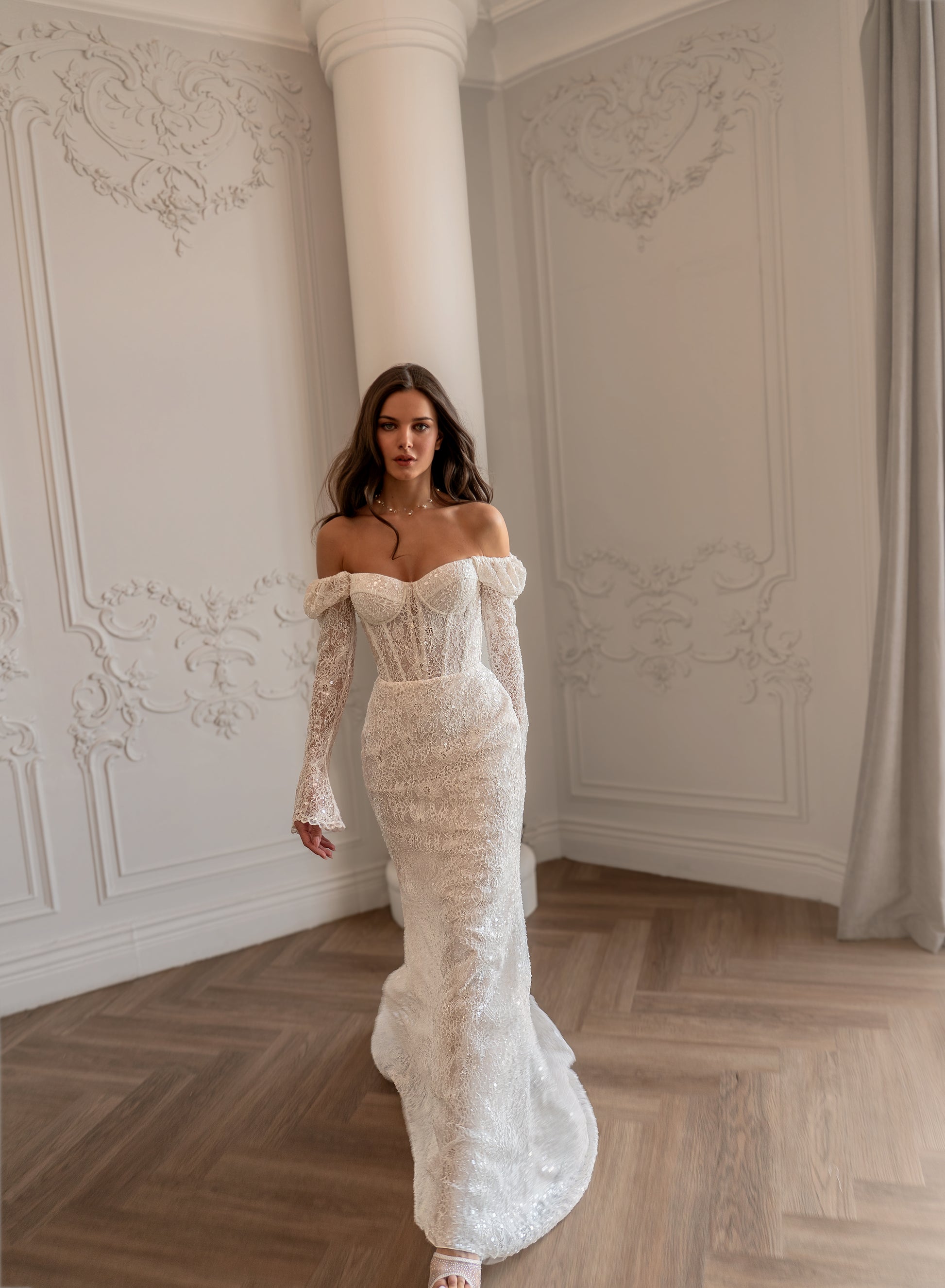 This elegant off-shoulder wedding dress features a beautifully fitted silhouette that highlights the figure. Delicate all-over lace with a subtle shimmer adds sophistication, while the long lace sleeves and soft neckline create a romantic, timeless feel. Perfect for brides seeking modern elegance with classic femininity.